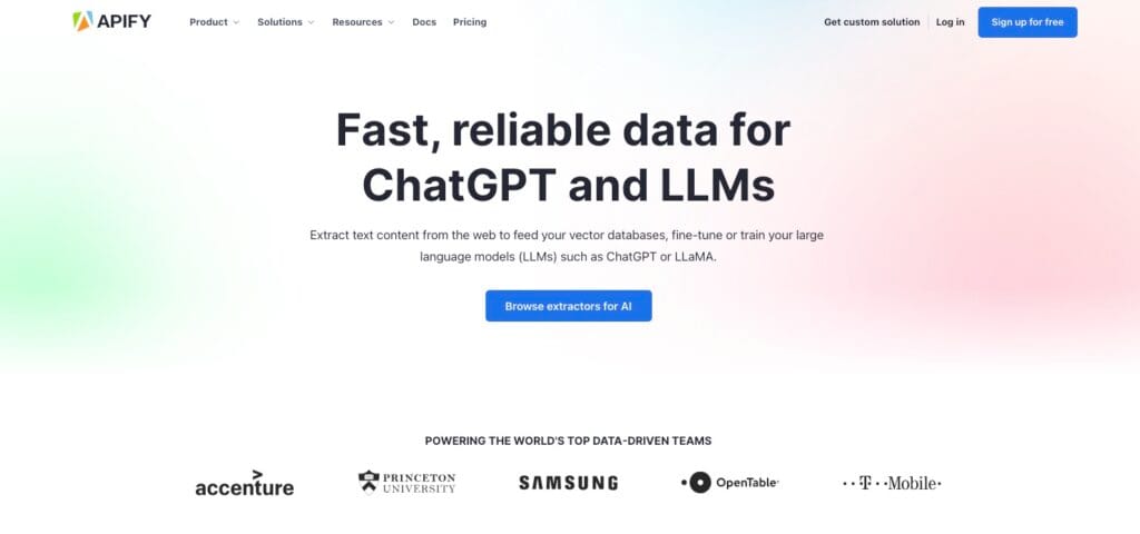 Apify is a no-code platform that simplifies web scraping for AI model training. It integrates with tools like LangChain and Pinecone, streamlining data collection from the web. This enhances AI efficiency, delivers accurate insights, and supports customized AI tool development.