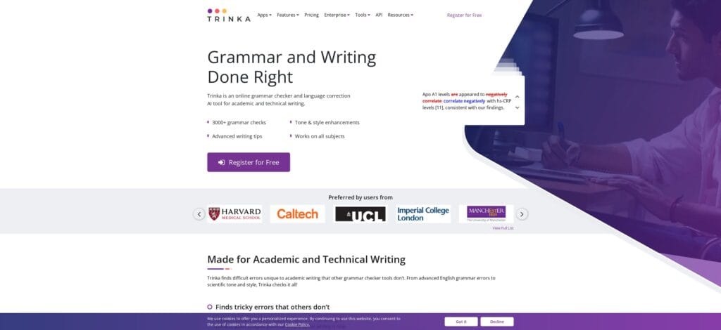Trinka is an online grammar checker and language correction AI tool for academic and technical writing. Trinka finds difficult errors unique to academic writing that other grammar checker tools don’t. From advanced English grammar errors to scientific tone and style.